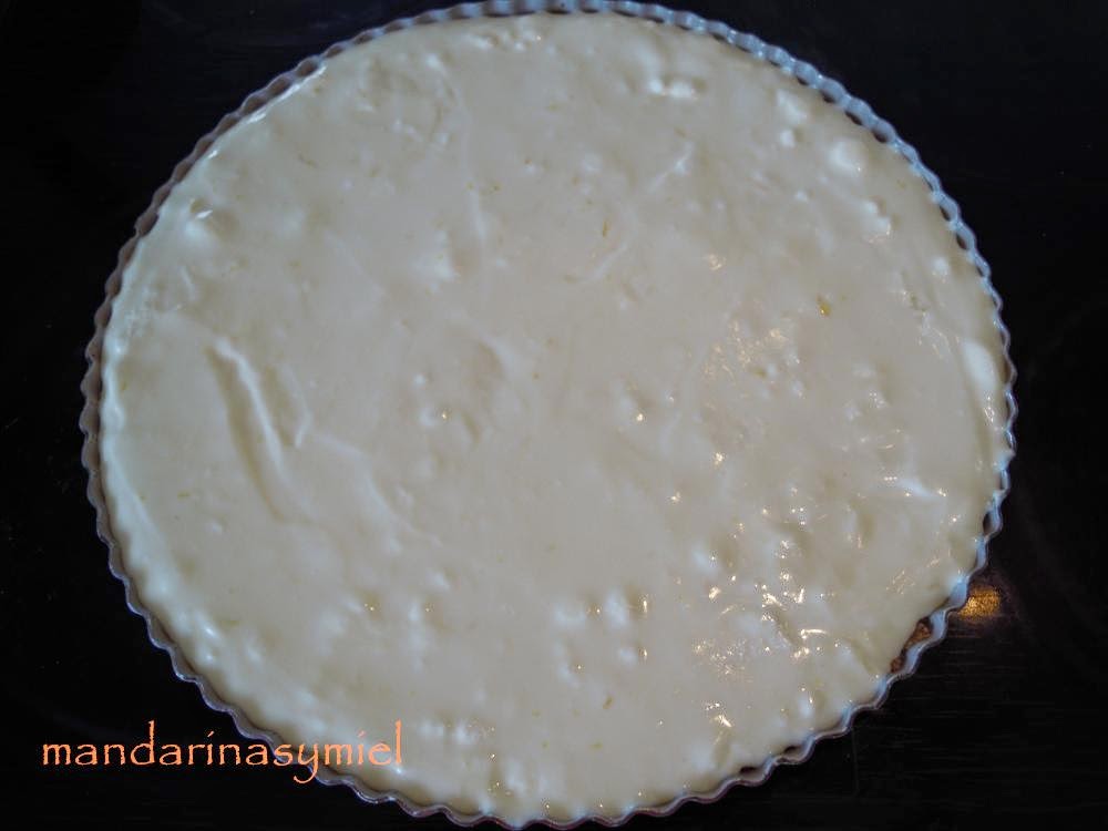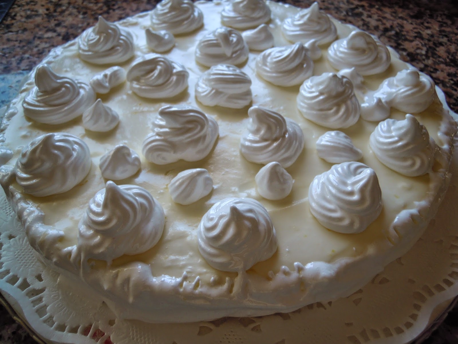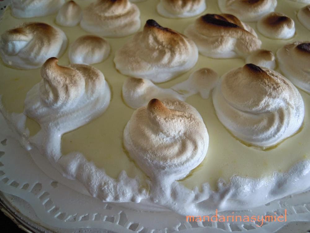 - Echa esta mezcla sobre la base de galletas y ponla en la nevera unas horas.Saca del molde y adórnala con mermelada de naranja, manzana o con merengue como he hecho yo, queda muy buena con todo. El merengue que he puesto lo he hecho con 2 claras y 100gr. de azúcar. Otro día os pondré el enlace del merengue italiano que queda mejor, pero es que no tenía tiempo.....
