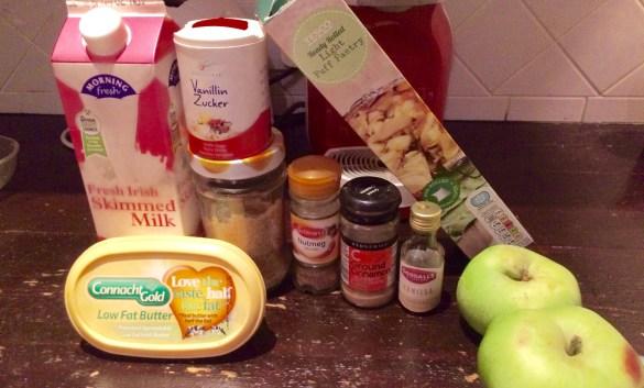 Todos los ingredientes que usaremos para esta tarta son bajos en grasas; he usado mantequilla especial baja en grasas, leche desnatada y hojaldre también bajo en grasas. Además para darle sabor usaremos esencia de vainilla, canela y nuez moscada. En mi caso he usado un poco de azúcar avainillado y azúcar moreno pero puse tan poco que me quedó acido igual, recomiendo usar Stevia para darle mas dulzura.