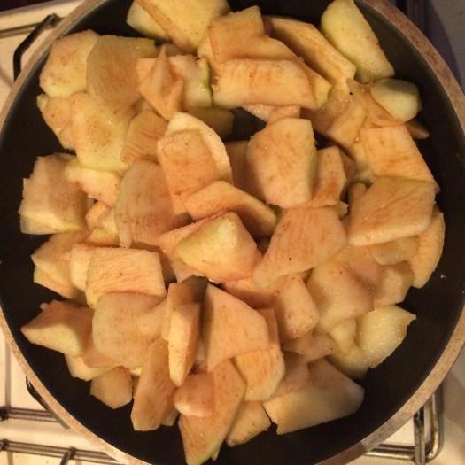 Ponemos un poco de mantequilla en la sartén y cuando se deshaga añadimos los trozos de manzana.