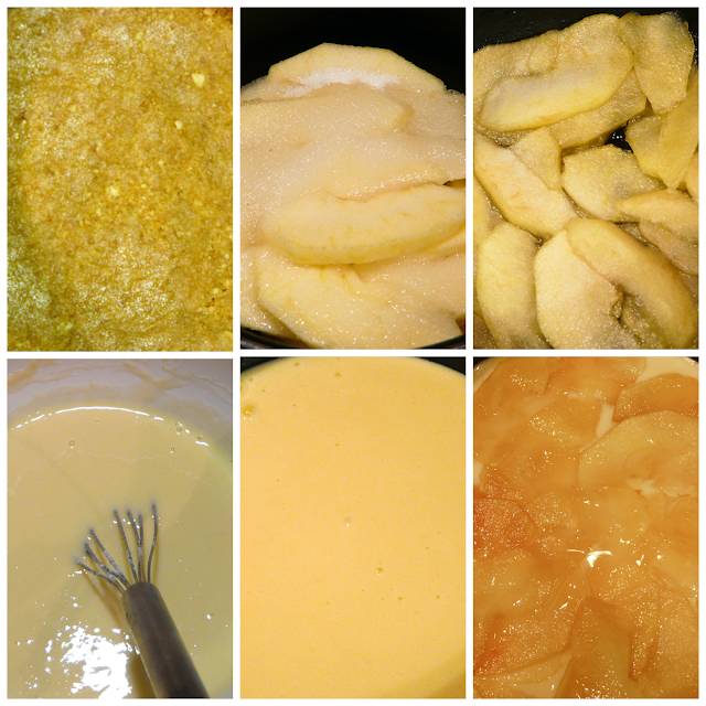 Para la base:,150 gr de galletas,80 gr de mantequilla derretida,1 cucharada de vino dulce (opcional),Para la cobertura:,1 manzana grande,7 cucharaditas de azúcar,30 ml de agua,Para el relleno,3 huevos L,3 yogures naturales (375gr),1 y 1/2 medida del yogur de azúcar,5 cucharadas soperas de harinaPrecalentar el horno a 180º, calor arriba y abajo.