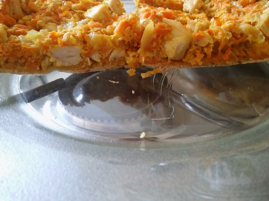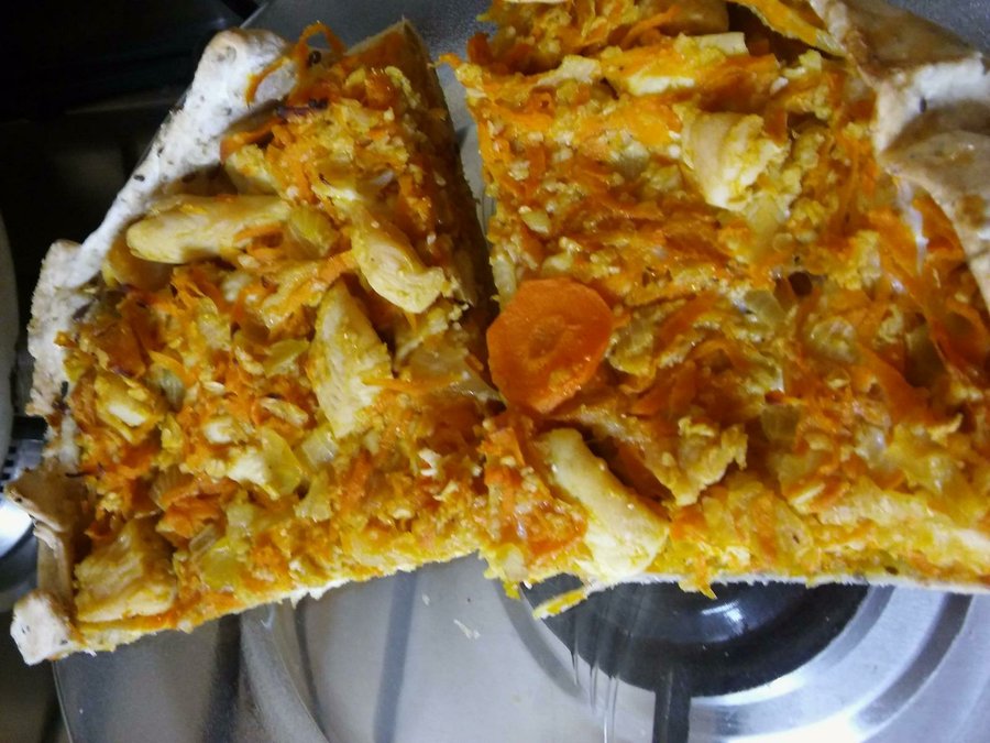 Empezamos cortando en cubos la pechuga y cociendola en un poco de aceite, agregamos la cebolla cortada en pluma (o como más les guste), salpimentamos y cocemos bien. Rallamos las zanahorias y las agregamos al pollo, cuando estén un poco tiernas tapamos la olla, apagamos el fuego y dejamos que repose (ahora pueden poner avena instantánea 1/2 taza). -Como no uso mucho aceite, lo que hice fue poner un poco del de oliva para que dore un poco el pollo, y luego solamente iba agregando agua para que cueza y no se pegue a la olla- Una vez frío, tenemos dos opciones, lo pasamos por la procesadora hasta que quede como un puré, lo ponemos en la pascualina y al horno 20 minutos o hasta que esté cocida la masa; o batimos un huevo, lo incorporamos a la mezcla y lo ponemos en la pascualina, acá le agregué un poco de cúrcuma porque le da un gustito especial (1 cdita). (de las dos formas queda buenísima)