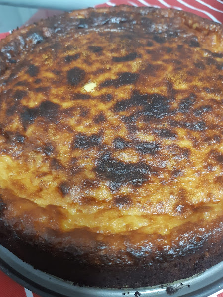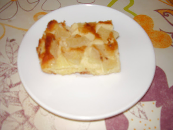 - 200 grs de queso (emmental queso fresco y queso de untar) siempre que sean quesos suaves sirve cualquiera de ellos - 4 huevos - 200 grs de leche - 200 grs de azúcar (la próxima vez le pondré 150 grs con 200 me ha parecido un poco empalagosa) - 1 pera - anís en granoPrecalentamos el horno a 170 - 180 grados, por arriba y por abajo.Ponemos en un bol los quesos, los mezclamos. Calentamos la leche y la añadimos a los quesos, los mezclamos bien y ya con la batidora, le añadimos los 4 huevos, elazúcar, el anís (un poquito), y lo volcamos en una fuente de cristal.