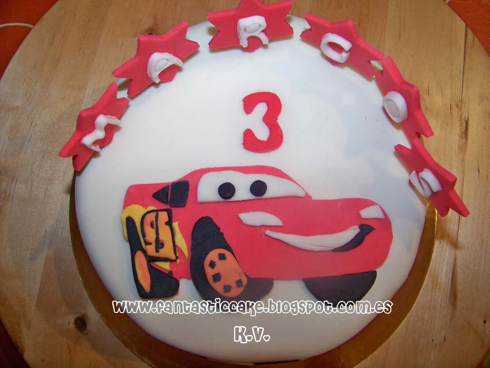 Aquí os subo la primera de las tartas de la semana pasada. Esta me la encargo la profesora de una de mis gemelas para su niño. Marcos cumplió 3 añitos y quería una tarta de Rayo McQueen. Así que entre varias opciones Diana se decidió por esta:
