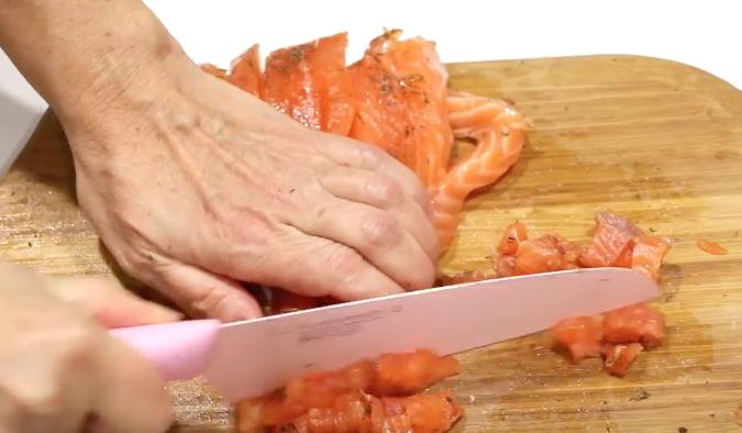 Lo primero que hacemos es marinar el salmón y cortarlo en trozos
