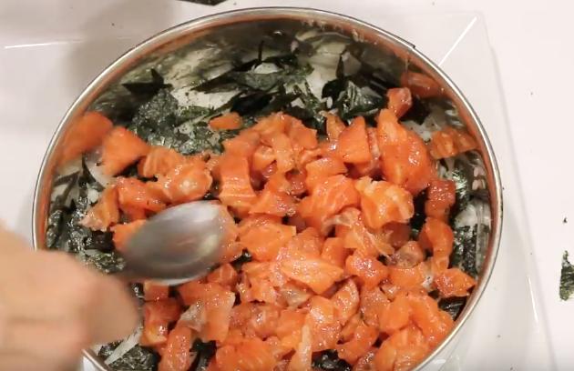 En un aro o molde sin fondo vamos colocando capas de arroz de sushi, alga Nori, salmón, queso crema y ahuacate