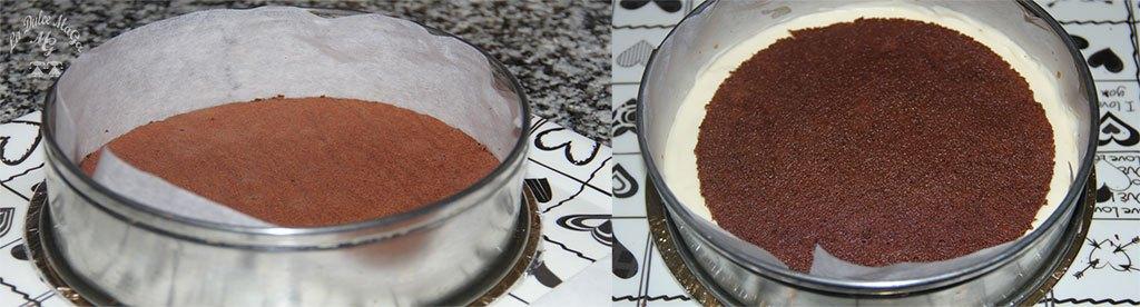 Y ahora viene el momento de montar nuestra tarta de tiramisú. Lo primero de todo será poner la base más grande del bizcocho sobre el molde (que habremos colocado encima de un plato o bandeja), como aparece en la primera foto. Después añadiremos la mitad del relleno de mascarpone y alisaremos bien. Colocamos ahora la otra plancha de bizcocho, la más pequeña, encima, como en la foto de al lado. Y vertemos el resto del relleno y dejamos la base lo más lisa posible.