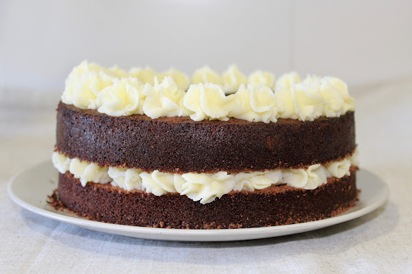 Una vez salga el bizcocho del horno, lo abrimos por la mitad y lo rellenamos con la buttercream. Echad una buena capa, que está MUY rica.