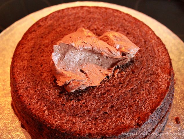 Para rellenar el bizcocho cortamos dos capas a diferentes alturas, calamos con almíbar y rellenamos la inferior de confitura de fresa y la capa superior de buttercream de chocolate negro.