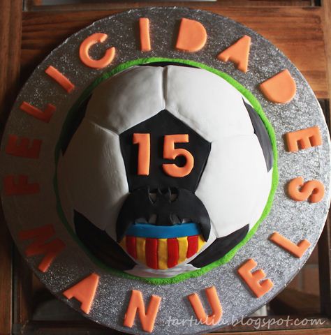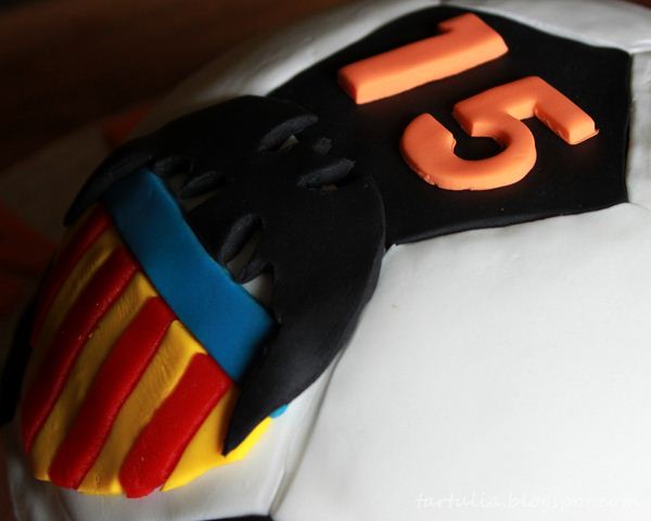 Las tartas de deporte no son lo que mas me inspira, y como un balón tenia poco color me decidí a entretenerme un ratito poniéndole el escudo de su equipo favorito, el Valencia C.F.