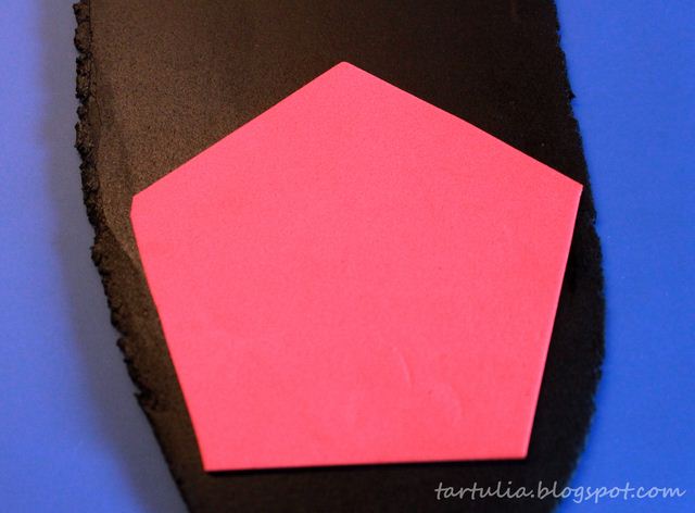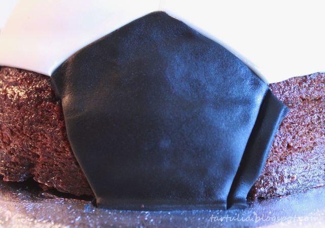 A la hora de la decoración tenia dos opciones, cubrir el bizcocho todo de fondant blanco y superponer los pentágonos negros, son embargo me pareció mas natural cortar las piezas y ensamblarlas, por lo que prepare unas plantillas de goma eva.