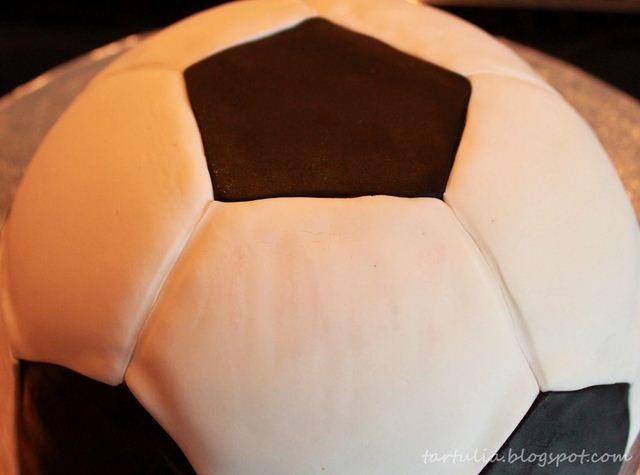 Hace unas semanas, Manuel se puso en contacto conmigo para encargarme una tarta de cumpleaños para su hijo. No tenía una idea definida y cuando me dijo que cumplía 15 años le propuse el balón. Quedo encantado con la propuesta y acordamos que ese seria el tema. Con respecto al bizcocho, chocolate negro con relleno de confitura de fresa la capa mas amplia y chocolate en la capa superior.