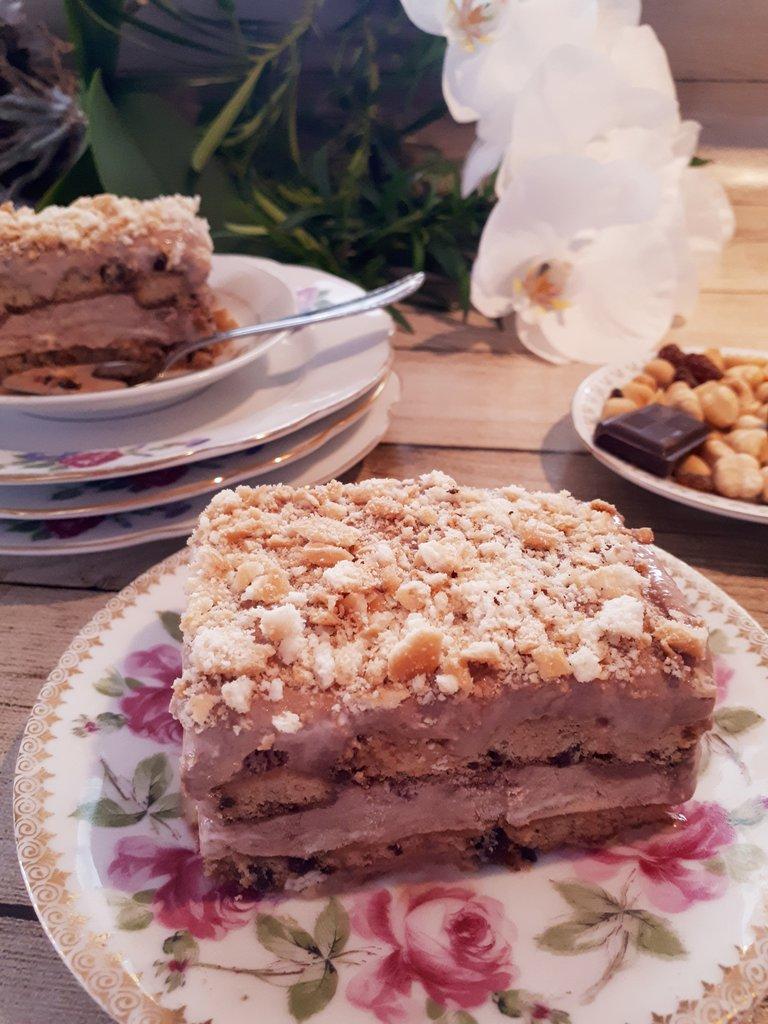 Forramos un molde cuadrado con papel film (para facilitar el desmoldado de la tarta) y vamos poniendo capas de galletas chip ahoy y helado. Comenzamos con una capa de galletas, lo cubrimos con una capa generosa de helado de vainilla y chocolate. Espolvoreamos trocitos de chocolate y frutos secos y aplanamos con la ayuda de una cuchara. Volvemos a colocar otra capa de galletas, nuevamente espolvoreamos chocolate troceado y frutos secos y cubrimos con más helado (alternamos vainilla con chocolate). Volvemos a aplanar la superficie. Finalmente cubrimos con las galletas trituradas y guardamos en el congelador un mínimo de 4 horas.