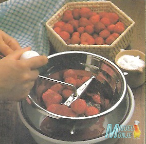 Mientras se congela, se trituran las fresas con una batidora, o un pasapure, reservando tres de las mas grandes.