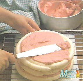 Se toman las planchas de nata congelada y se intercala entre cada una de ellas una capa de nata de fresas.