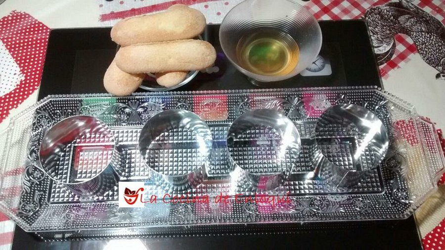 Para el montaje de las tartas nos vamos a a ayudar de unos aros de emplatar, moldes redondos de tamaño pequeño. Colocamos estos moldes sobre una bandeja. Mojamos los bizcochos de soletilla en el almíbar de ron y los colocamos como base, en el fondo de los aros. Así dejamos toda la base cubierta de bizcocho calado.