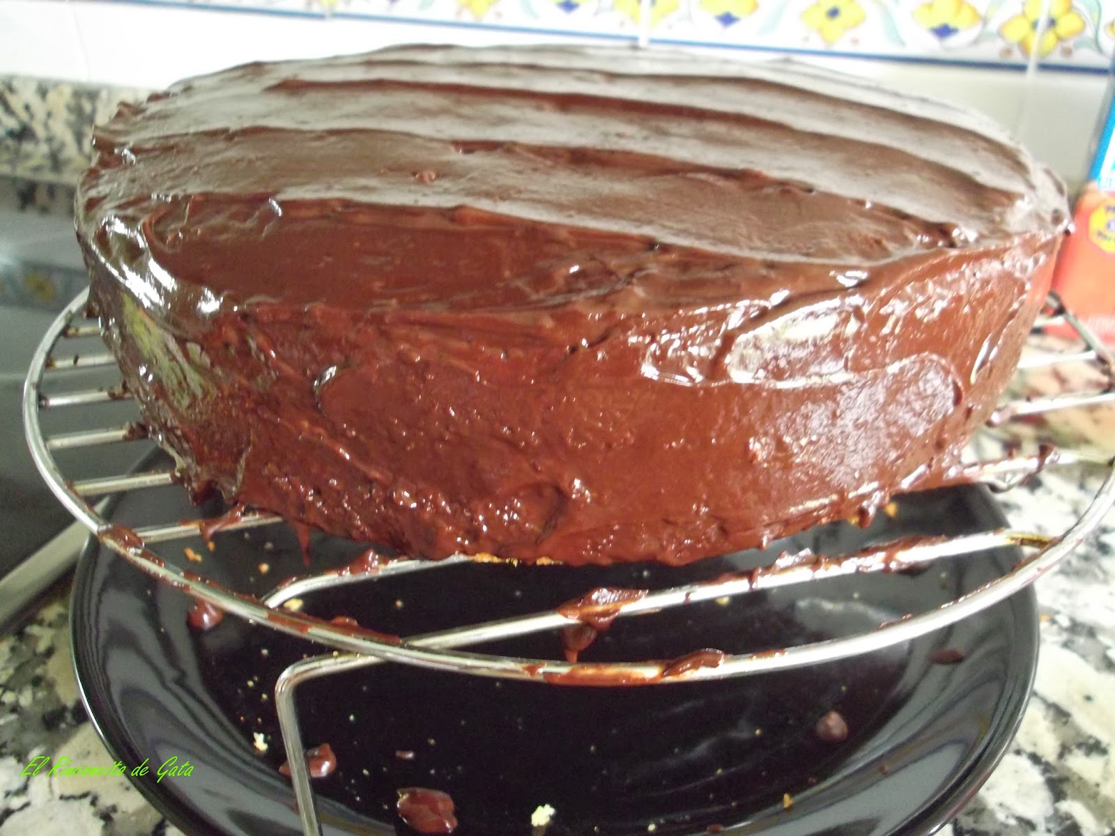 Ahora cubriremos la tarta con el chocolate de cobertura, para ello lo pondremos en un cuenco y le daremos tandas de 30 segundos en el microondas, sacamos y movemos, así hasta que esté liquido. Cubrimos todo el bizcocho.