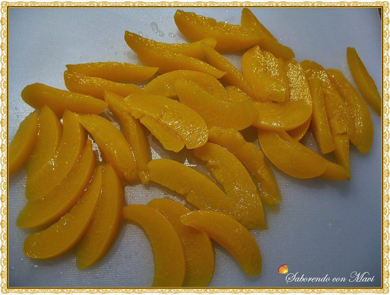 Cortamos los melocotones en gajos finos, los ponemos encima del relleno y terminamos decorando con más crema.