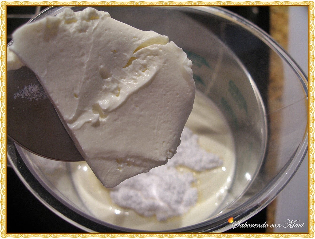 Ahora poner en la thermomix o en el vaso de la batidora la nata muy fría el azúcar glas, el aroma y el queso. Batir con cuidado de no pasarse y no se haga mantequilla.