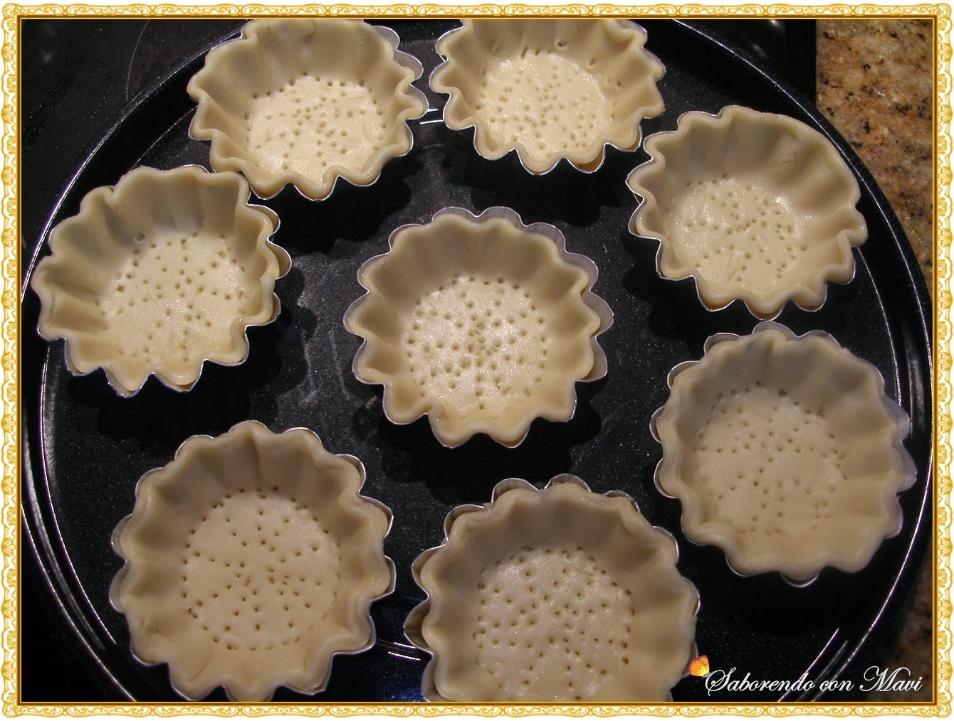 Cortamos unos círculos en el hojaldre y forramos los moldes engrasados.Pinchar el fondo para que no suban mucho.