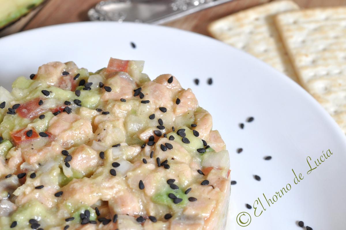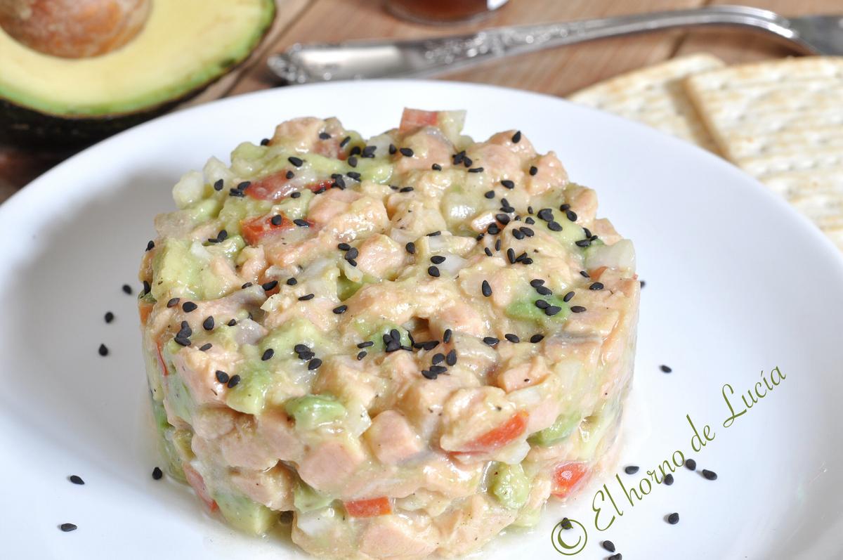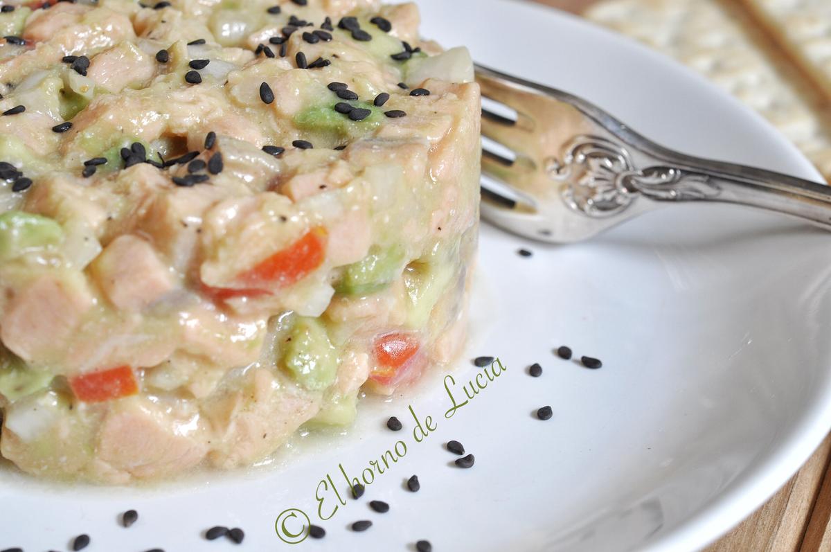 Tartar de Salmón ahumado y AguacateIngredientes:Salmón ahumado 100 grs.1 aguacate maduro1/2 Cebolleta o cebolla blanca Zumo de 1/2 limón o vinagre1 Cda. Salsa de soja1/2 cucharada MielAceite de oliva virgen extra SalPreparación:Troceamos el salmón ahumado en cuadraditos. Añadimos la cucharada de salsa de soja y la miel y lo dejamos macerar en la nevera 1 hora.Por otro lado, troceamos también el ag ...