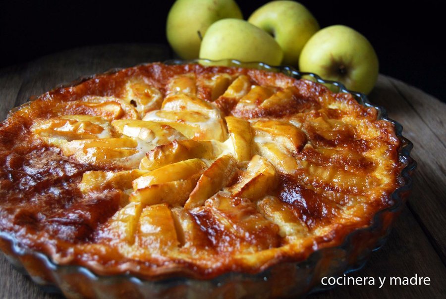 Una deliciosa tarta muy fácil de preparar todo el trabajo lo va hacer el horno por nosotros, se come caliente y su sabor es inigualable; para prepararla tenemos que forrar un molde con una masa quebrad o brisa, dentro de ella colocamos las manzanas cortadas en gajos y llevamos todo al horno hasta que la masa este echa. Una vez que la masa esta dorada y sacamos la tarta y le vertemos una mezcla de huevos, nata o crema de leche y azúcar y de nuevo llevamos al horno hasta que este cuajada, sacamos y servimos caliente,...buenísima!!! Tenéis esta receta y muchas mas en mi blog Cocineraymadre