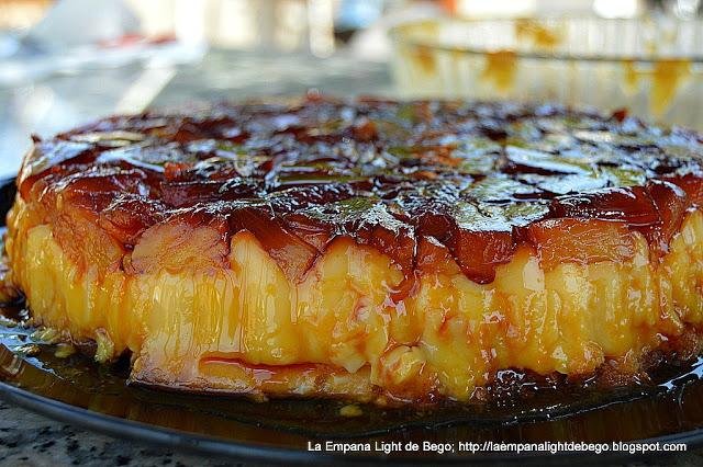 De La empana light de Bego te sugiero una Tarta de flan con piña. Sobre la base del molde, vierte caramelo líquido, añade trozos de piña y el preparado de flan con leche. Cubre con bizcochos toda la base y, tapada con film, deja enfriar en la nevera. Una vez la tarta haya cuajado, saca de la nevera, dale la vuelta y...tarta lista. Fácil y deliciosa.