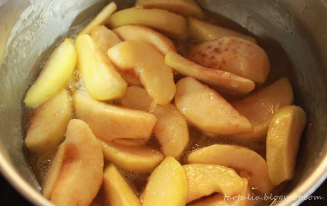 Añadimos los gajos de manzana y dejamos cocer unos 10 minutos hasta que se reblandezcan un poco.