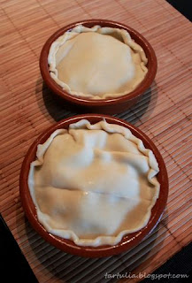 Cortamos en la plancha de bizcocho dor circulos un poquito mas anchos que el borde de las cazuelitas, la coocamos sobre las manzanas y metemos los bordes.