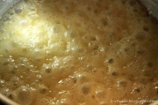 Ponemos en un cazo al fuego el azucar y lo tostamos un poco, en mi caso yo no espere a que se hiciese oscuro, añadimos la mantequilla y removemos a fuego medio hasta que se forme un almibar un poco espesito.