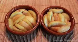 Sacamos del fuego y colocamos los gajos ordenados en las cazuelitas de barro, con una cuchara rociamos con el mismo almibar sobre las manzanas, como ya advertia Dulce Algodon en su blog, sobro un poco ya que no lo quise poner todo.