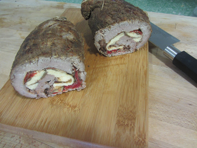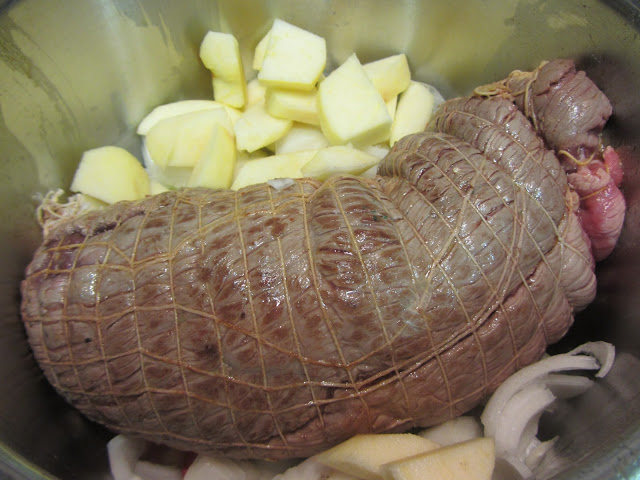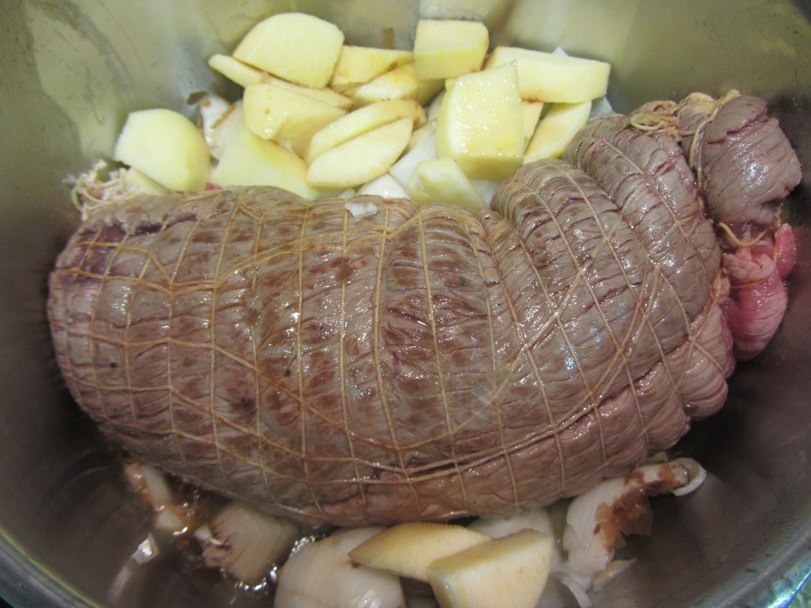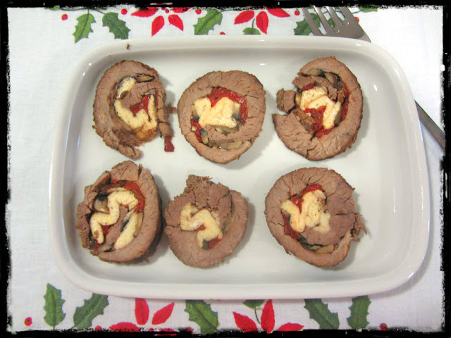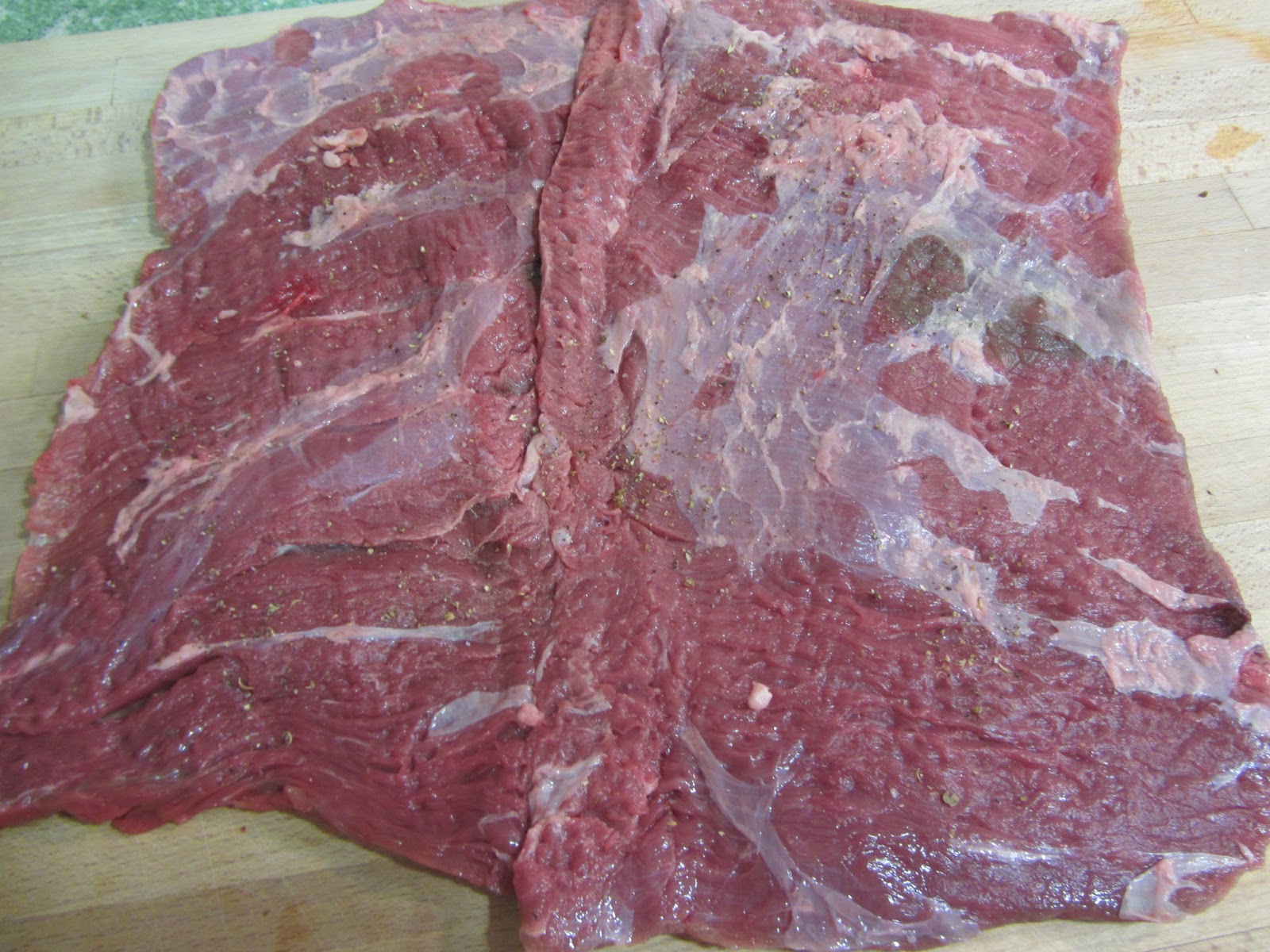 Aunque en casa siempre se ha preparado con aleta de ternera, esta vez el carnicero me recomendó otro corte, que, según dijo, era más apropiado para el relleno, porque la carne queda más tierna y jugosa. Creo que lo llamó "cuadrado de tapa" o algo así... y la verdad es que la recomendación fue muy acertada: la carne quedó deliciosa y en su punto.