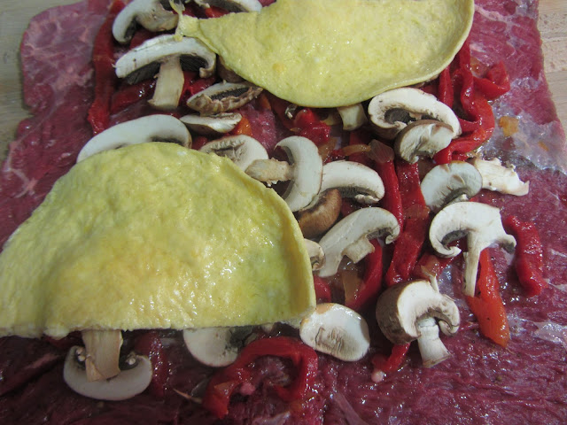 ... y la tortilla. Dejamos libre de relleno un espacio de 1-2 dedos, que será la parte que quede arriba del todo cuando enrollemos la carne.
