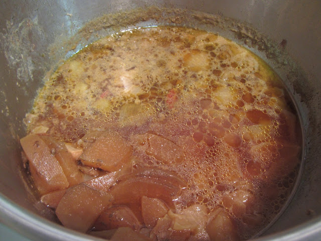 Dejamos rehogar un minuto. Tapamos, y cocemos en la olla a máxima presión (con todas las rayitas fuera, en la mía, que es WMF Perfect) durante 25 minutos.