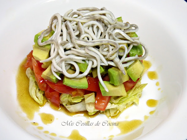 En un aro de emplatar ponemos, lechuga, tomate y aguacate, presionamos un poco para que no se caiga, echamos un poco de vinagreta y la mitad de la lata de gulas escurridas en cada timbal...