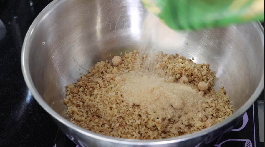 2. Pelar las nueces (las limpio de una manera nueva en el video))) Moler las nueces, mezclarlas con azúcar y mantequilla derretida.