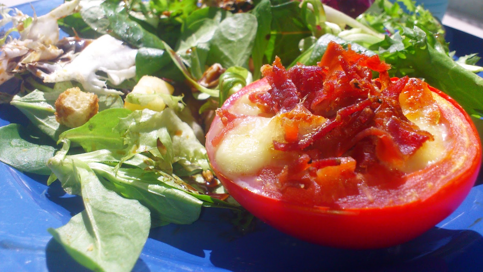 Retiramos del horno, ponemos el crujiente de jamón encima y tenemos un magnifico tomate relleno con el que quedaremos como auténticos chefs delante de nuestros comensales.