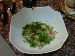 En un tazón poner el pan, la cucharada de aceite de oliva, los dos dientes de ajo triturado, y las dos cucharadas de perejil picado. Ajustar la sal y mezclar bien.