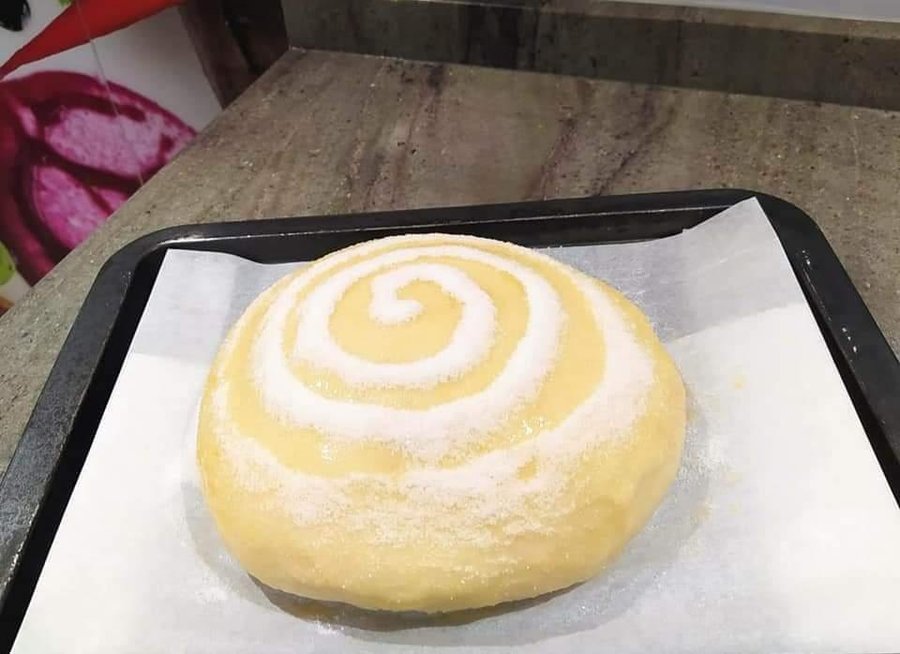 15. Una vez hayan fermentado, pincelar con huevo batido y espolvorear con azúcar en forma de espiral para decorar.