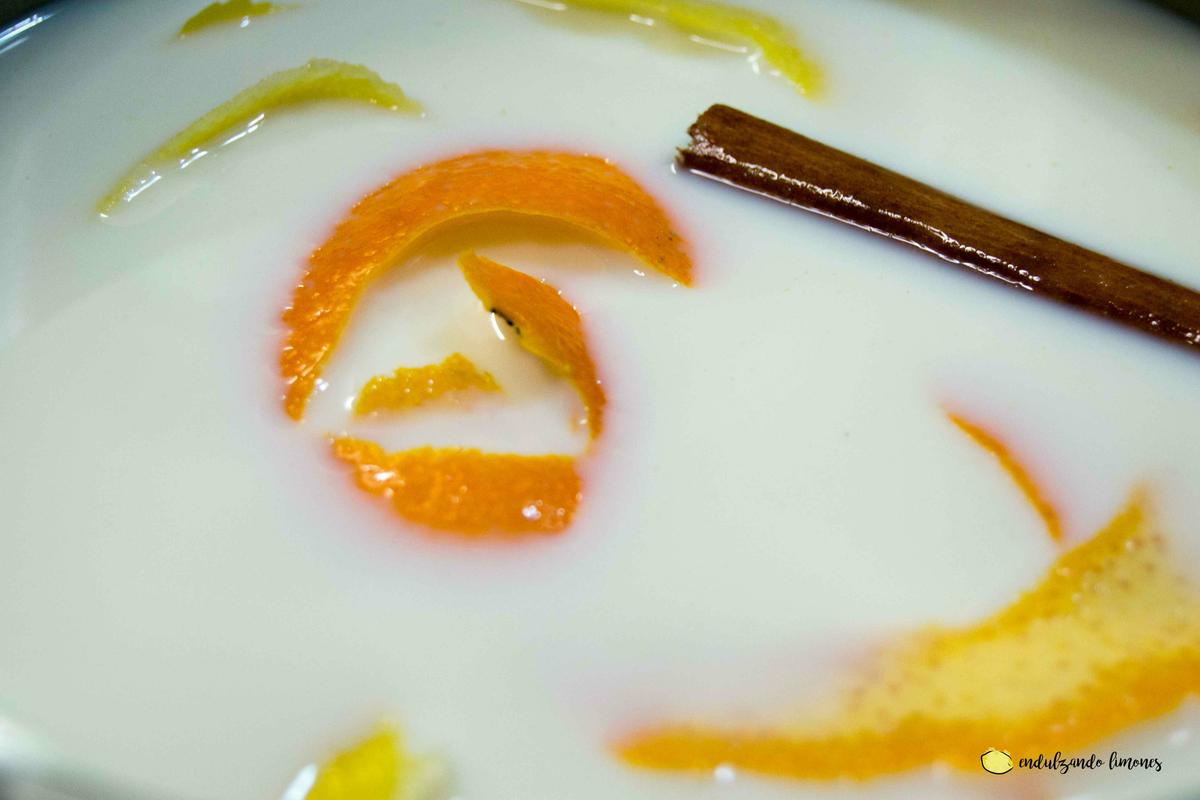 En una cacerola grande, echamos la leche, la canela, el azúcar (6 cucharadas soperas) y las cáscaras de limón y naranja. Ponemos a fuego medio hasta que esté caliente, pero sin que llegue a hervir.