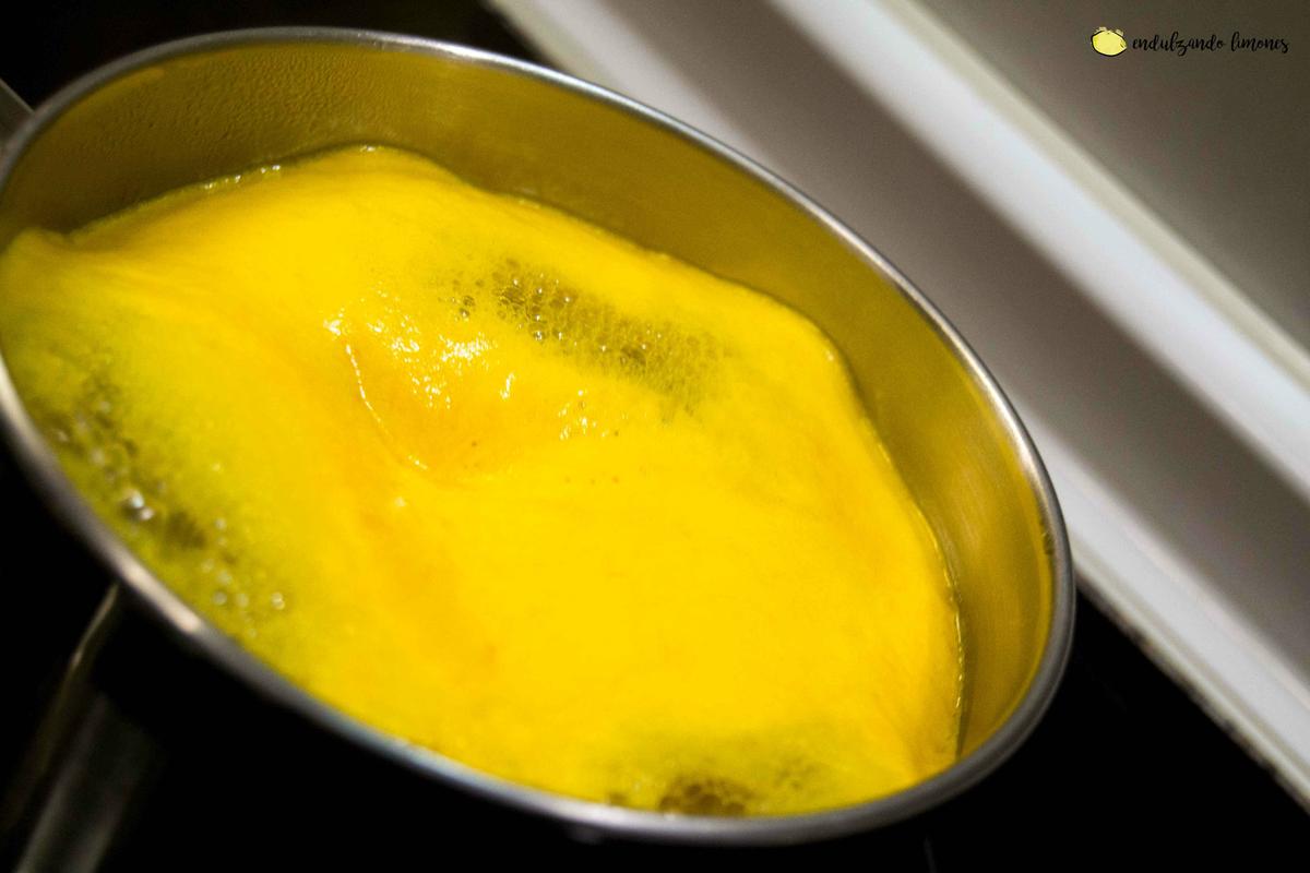 Lo primero que vamos a hacer es preparar el almíbar: exprimimos el zumo de dos naranjas, y añadimos el azúcar. Vertemos todo en un cazo pequeño, y llevamos a fuego medio. Tenemos que dejarlo así durante el tiempo que vayamos preparando nuestras torrijas, sin que llegue a ebullición. Cuando veamos que ya se haya formado una capa por encima, desespumamos: de esta forma, quitamos el amargor. Es importante que esté caliente para, cuando ya tengamos listas nuestras torrijas, lo echemos por encima de ellas, así que mantenemos a fuego lento.