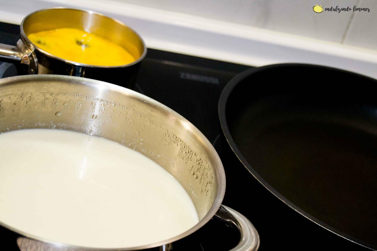 Es importante que tengamos todos los utensilios y mezclas juntos, porque vamos a necesitarlos todos: el plato con huevo, la cacerola con leche y la sartén con mantequilla.