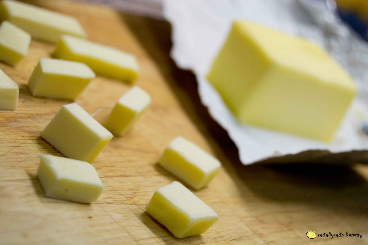 Partimos dados pequeños de mantequilla: será lo que utilicemos para hacer nuestras torrijas a la plancha, añadiéndolos para que no se queden pegadas a la sartén. Ponemos la sartén a fuego medio, y añadimos el primer dado de mantequilla.