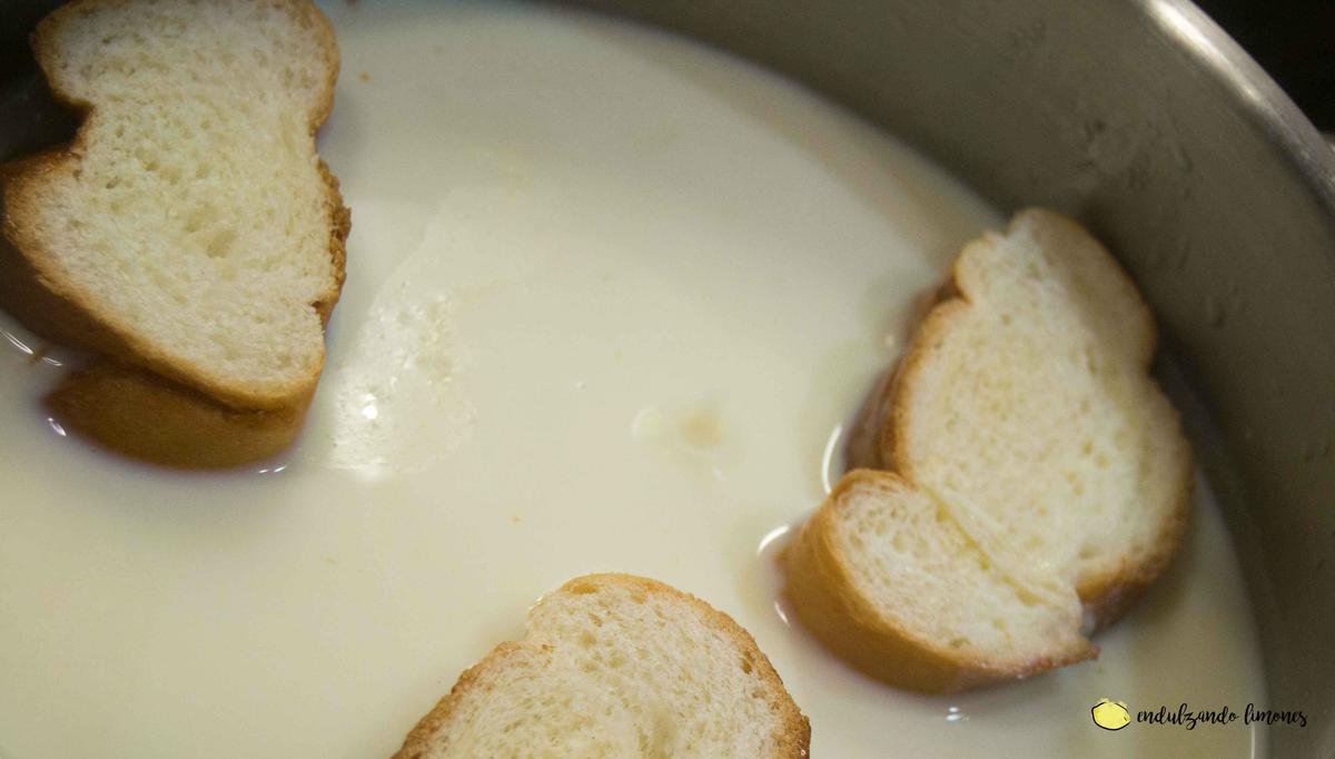 Cogemos una rebanada de pan y, con cuidado, la bañamos en leche por los dos lados para que se empape bien.