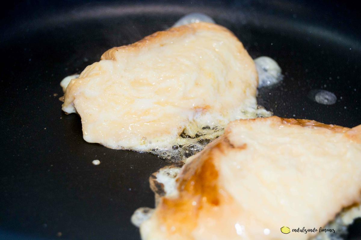 Sacamos de la leche, con mucho cuidado de que no se rompa, y llevamos al plato de huevo. Bañamos bien, por los dos lados.