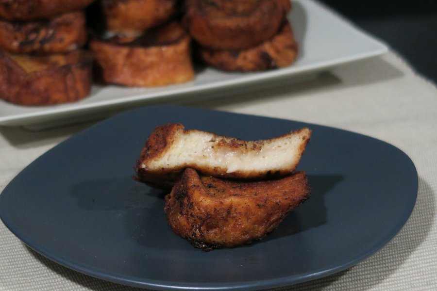 3- Cuando estén blanditas las rebozamos en huevo con azúcar y las freímos