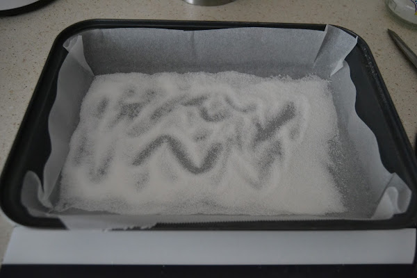 Ahora forramos un molde con papel manteca ( o lo enmantecamos y enharinamos bien) y lo cubrimos con azúcar. Bastante azúcar y unos trocitos de manteca.