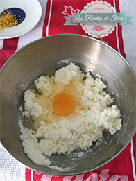 Mientras esperamos que se enfrie, hacemos el relleno. Simplemente le agregamos a la ricota el resto de los ingredientes. La ralladura de limon, el azúcar y los huevos. Lo revolvemos bien y tambien lo llevamos a la heladera hasta que este la base lista.