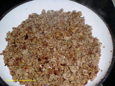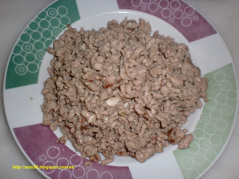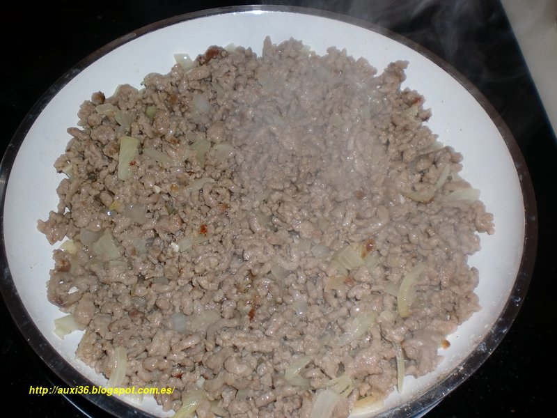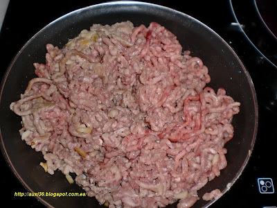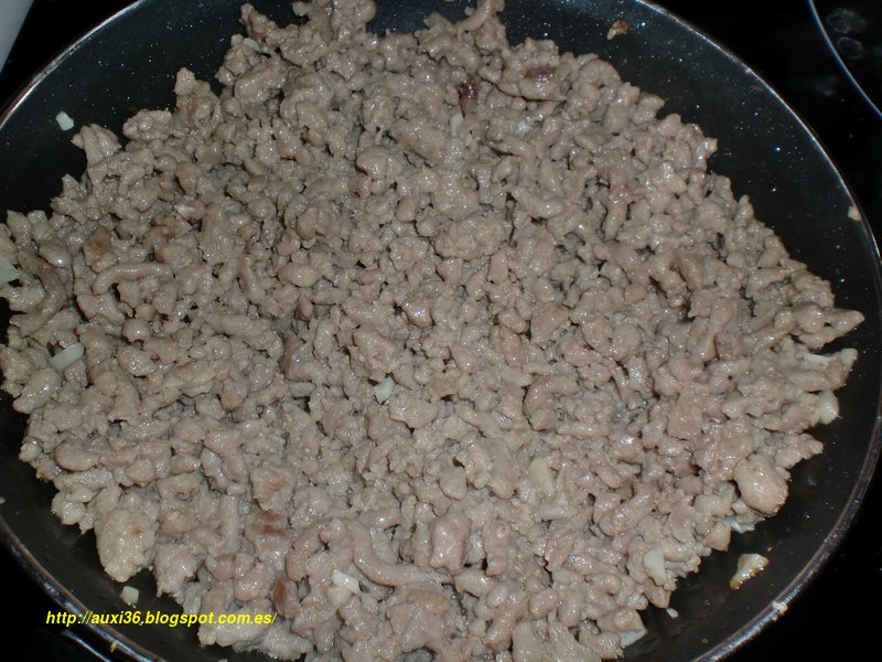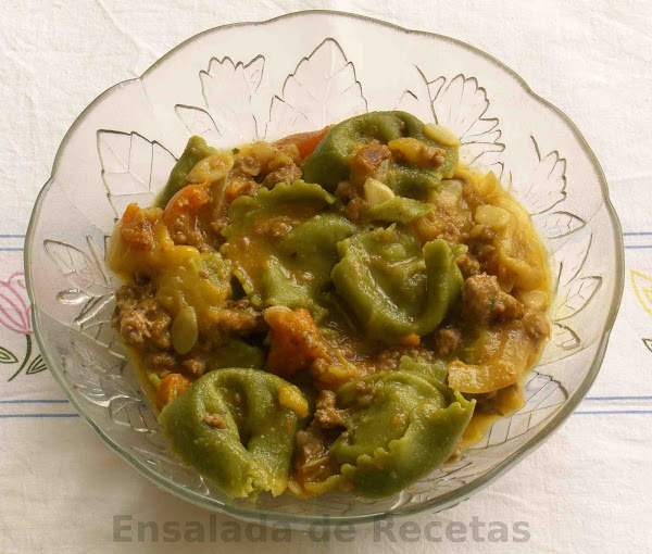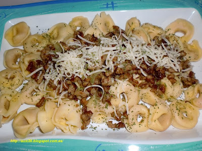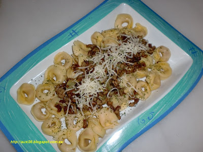 Tortellini,carne picada de ternera,cebolla,aceite de oliva,sal ajos y especias.