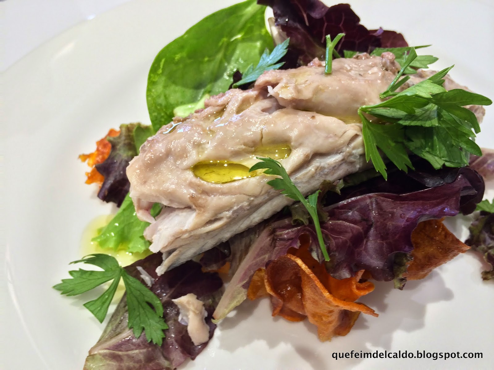 Añadir encima los distintos ingredientes: patatas, caballa, cebolla, lechuga y grosellas.