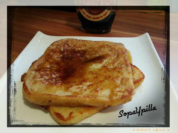 - Batimos los huevos en un plato hondo junto con la leche, la cucharada de canela y la esencia de vainilla.Ponemos una sartén al fuego (medio/alto) con un trocito de mantequilla y mientras se calienta, metemos las rebanadas de pan en la mezcla anterior. Dejamos que se impregnen bien unos 10 segundos por cada lado.Una vez el fuego está caliente las echamos a la sartén y dejamos por 25 segundos por cada lado, o hasta que las veamos doradas.Servimos en un plato con abundante sirope de arce o miel por encima, espolvoreamos azúcar moreno al gusto y podemos poner también un trocito de mantequilla.*Yo le pongo más canela por encima.
